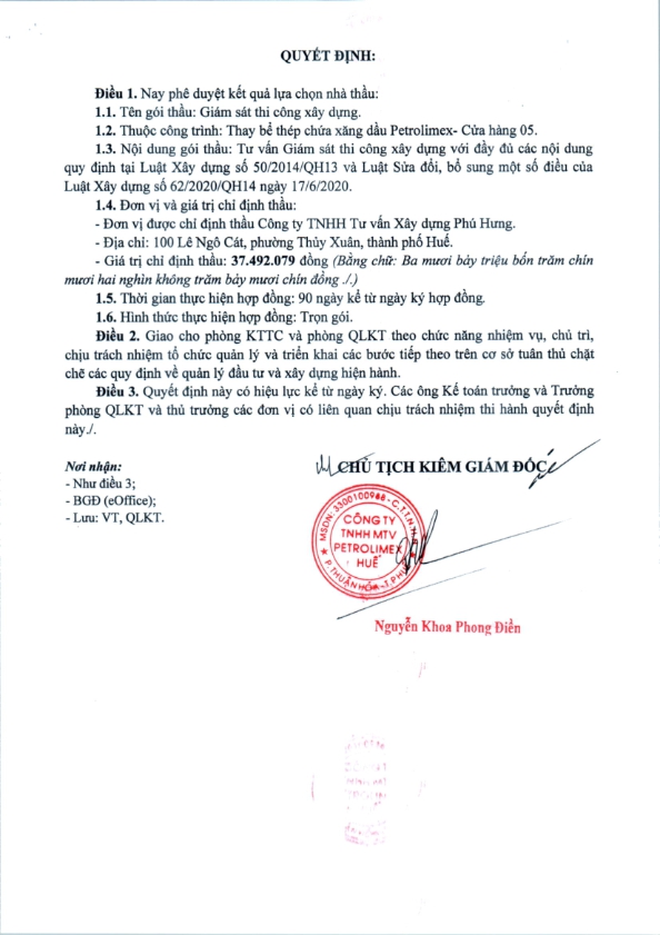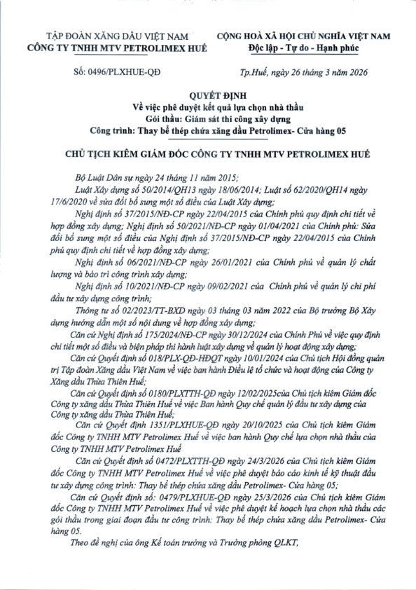 Kết quả lựa chọn nhà thầu Gói thầu: Giám sát thi công xây dựng Công trình: Thay bể thép chứa xăng dầu Petrolimex- Cửa hàng 05